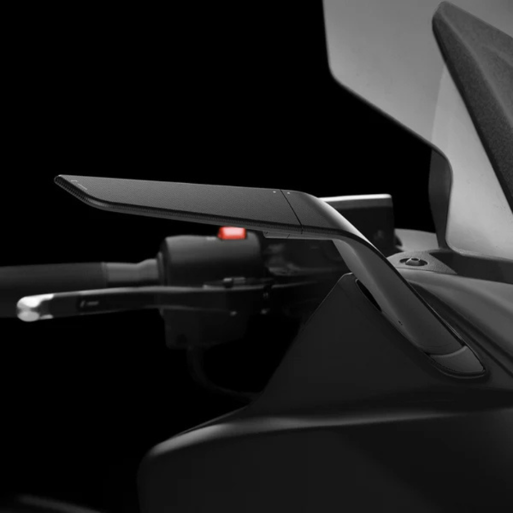Ces rétroviseurs sont composés de deux parties : une partie fixe qui se monte directement sur le carénage, et une partie mobile servant de support pour le miroir. Grâce à un ingénieux système de rotation reliant les deux éléments, il est possible d’aligner facilement le miroir. En position fermée, il se transforme en véritable élément aérodynamique.